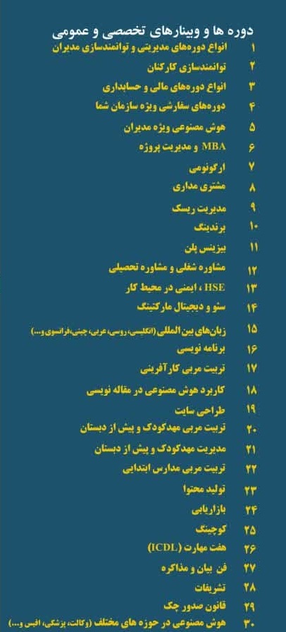 برای دریافت عناوین دوره های آموزشی گروه علوم کامپیوتر ، فنی ومهندسی ، علوم انسانی و پزشکی کلیک نمایید