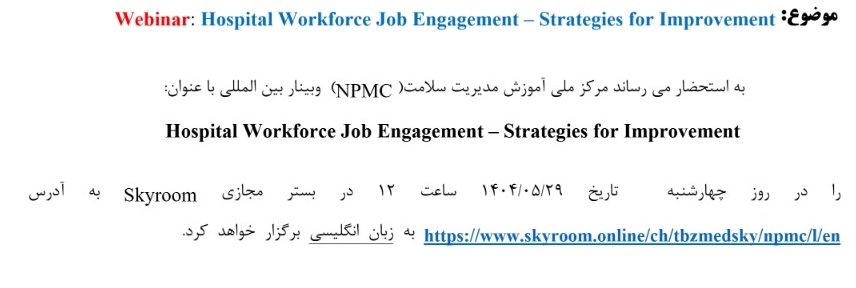 وبینار آموزشی بین المللی Hospital Workforce Job Engagement – Strategies for Improvement ۲۹ مرداد ۱۴۰۴ | ۱۰:۰۱ کد : ۵۳۹۲۵ اطلاعیه ارسال به دیگران نام شما ایمیل شما ایمیل دریافتکننده ارسال انصراف تعداد بازدید:۱۷۹۰ وبینار آموزشی بین المللی Hospital Workforce Job Engagement – Strategies for Improvement