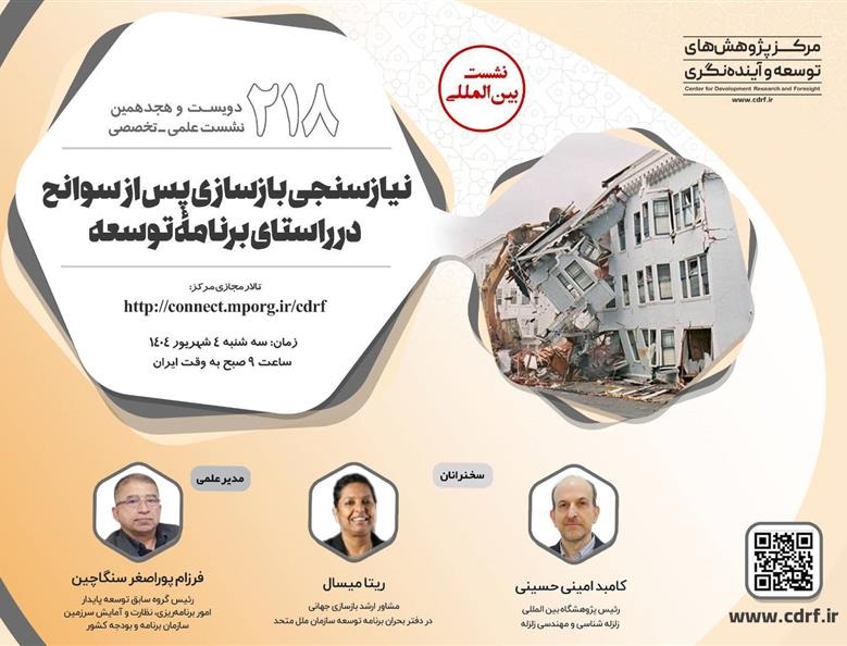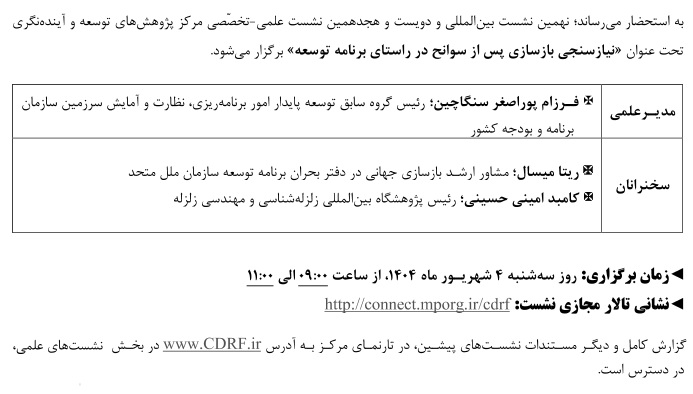 نشست علمی نیاز سنجی بازسازی سوانح در راستای برنامه توسعه ۰۳ شهریور ۱۴۰۴ | ۱۲:۳۷ کد : ۵۴۰۰۰ اطلاعیه ارسال به دیگران نام شما ایمیل شما ایمیل دریافتکننده ارسال انصراف تعداد بازدید:۱۶۶۱ نشست علمی نیاز سنجی بازسازی سوانح در راستای برنامه توسعه، توسط مرکز پژوهش های توسعه و آینده نگری برگزار می گردد.
