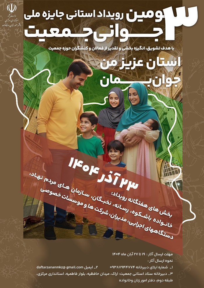 سومین رویداد استانی جایزه ملی جوانی جمعیت در7 محور خانواده با شکوه ، رسانه ، سازمان های مردم نهاد ، دستگاه های اجرائی ، شرکت ها و موسسات خصوصی ، مدیران و نخبگان در تاریخ 23 آذر ماه سال جاری برگزارخواهد شد.