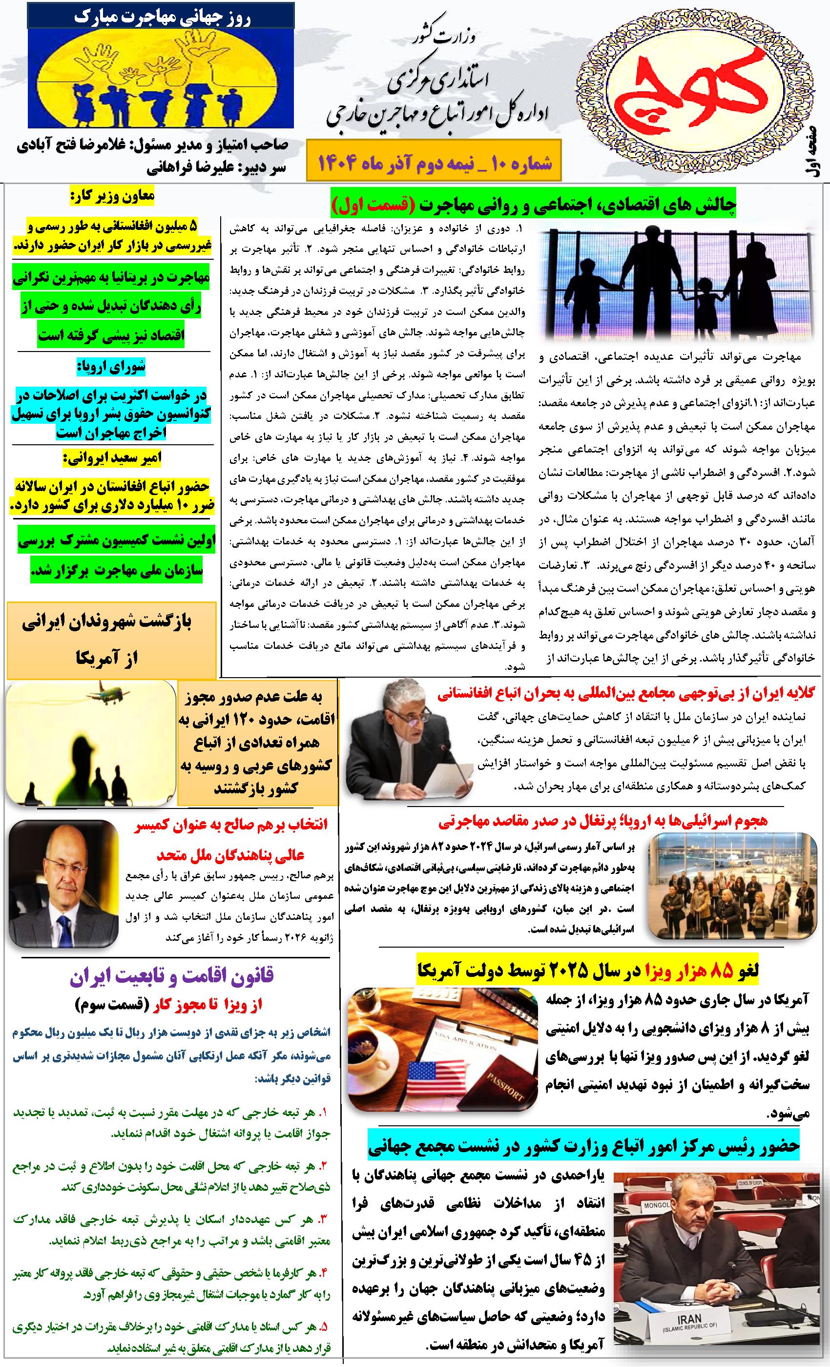 دهمین شماره نشریه کوچ ۰۳ دی ۱۴۰۴ | ۰۹:۲۱ کد : ۵۷۵۲۰ اطلاعیه ارسال به دیگران نام شما ایمیل شما ایمیل دریافتکننده ارسال انصراف تعداد بازدید:۱۲۶ دهممین شماره نشریه کوچ، توسط دفتر امور اتباع و مهاجرین خارجی استان مرکزی منتشر گردید.
