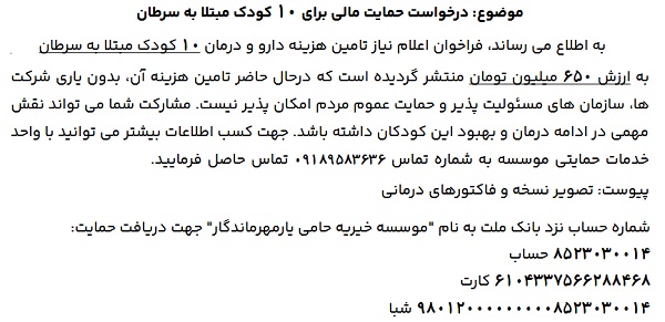 درخواست حمایت مالی، برای ۱۰ کودک مبتلا به سرطان ۰۷ بهمن ۱۴۰۴ | ۱۱:۳۳ کد : ۵۷۷۳۲ اطلاعیه ارسال به دیگران نام شما ایمیل شما ایمیل دریافتکننده ارسال انصراف تعداد بازدید:۱۹۱ موسسه خیریه حامی یار، درخواست حمایت مالی، برای ۱۰ کودک مبتلا به سرطان را دارد.