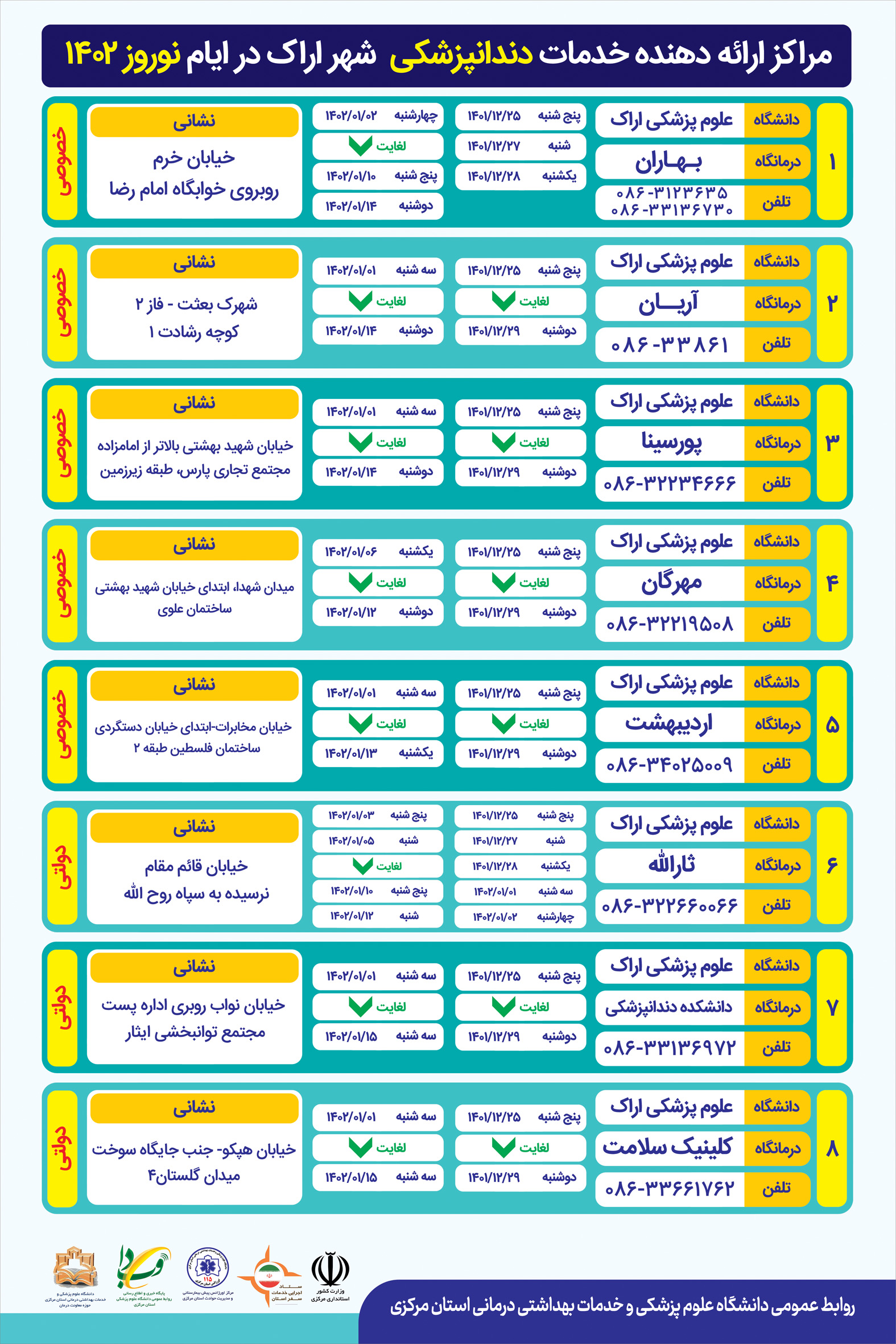 مراکز ارائه دهنده خدمات دندانپزشکی شهر اراک در ایام نوروز ۱۴۰۲ تعداد بازدید:۹۲۰ ارسال به دیگران نام شما ایمیل شما ایمیل دریافتکننده ارسال انصراف